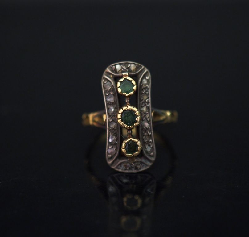 Bague marquise en or jaune, sertie d’une ligne de trois pierres vertes, entourée de petits éclats de diamants. TDD. 54 Poids tel. 5,41 g