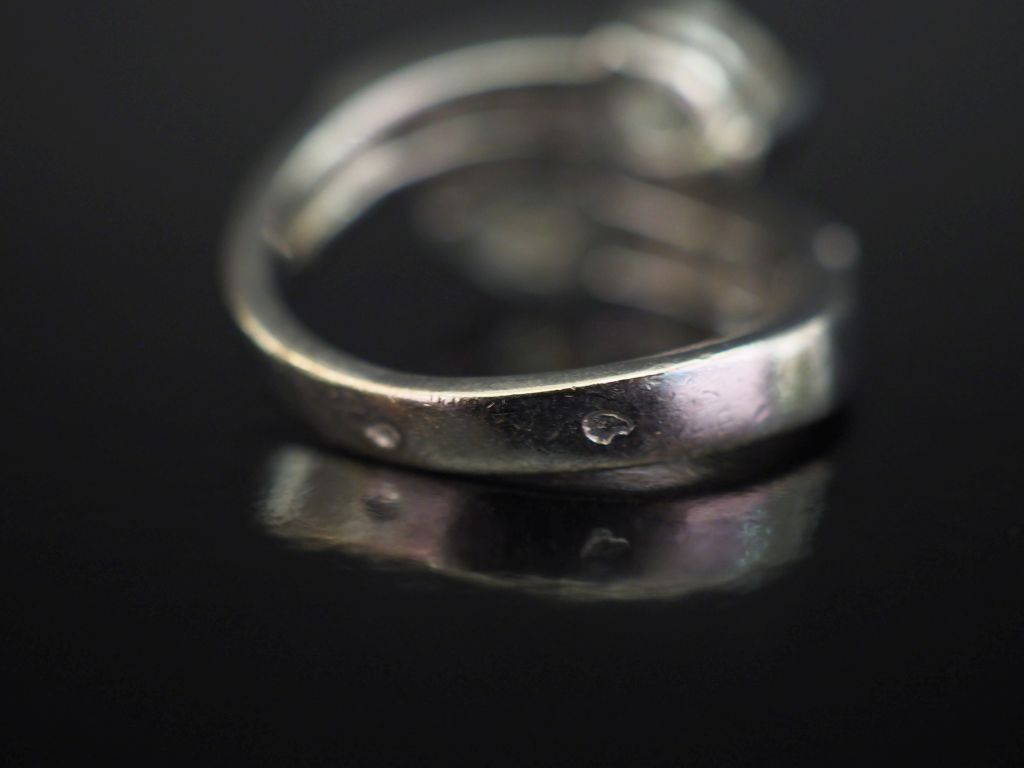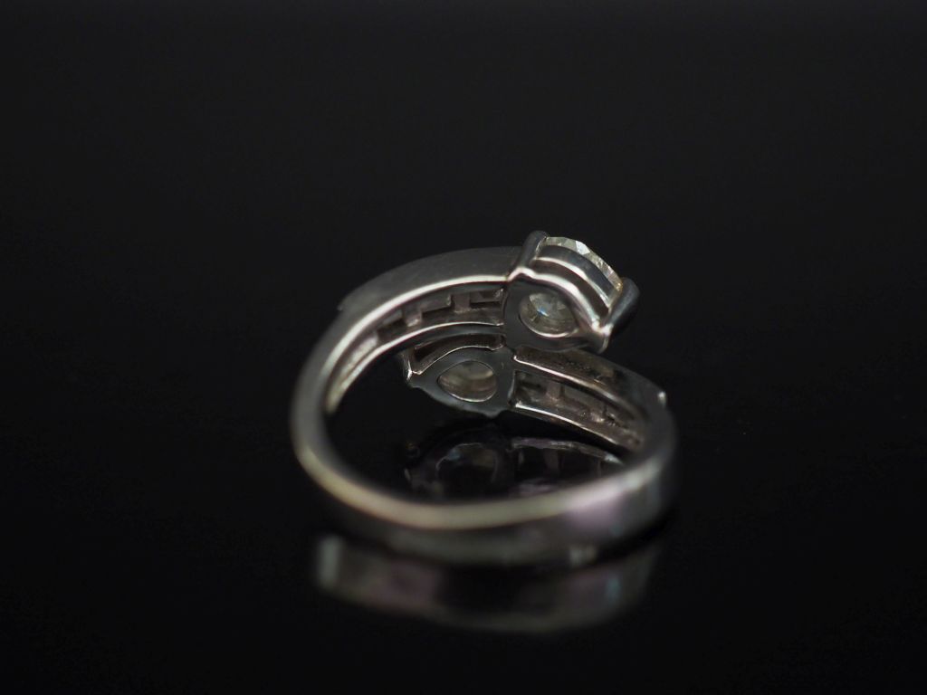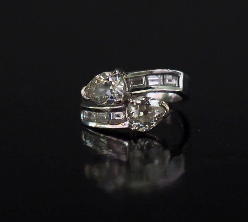 Bague moderne dite "Toi Moi" en or blanc, sertie de deux diamants taille poire de 0,8 ct environ. Jolie monture mouvementée, sertie de six diamants taille baguette. TDD. 53 1/2 Poids tel. 6,88 g