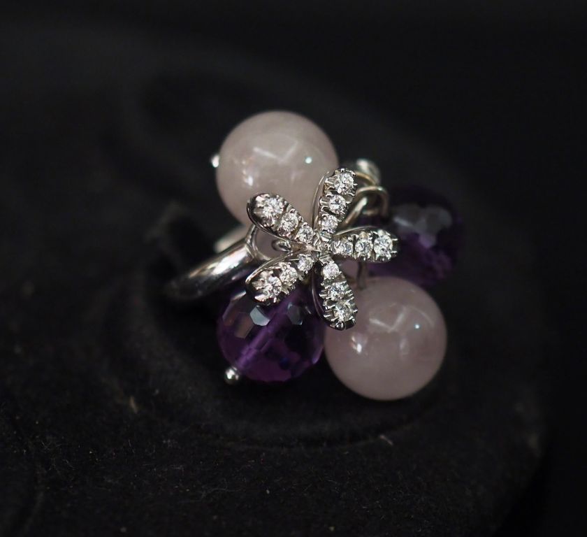 Bague moderne en or blanc, ornée d'une pendeloque en or blanc en forme de marguerite et sertie de petits diamants, et de cinq pendeloques en pierre dure ou verre. TDD. 54 Poids tel. 13,11 g