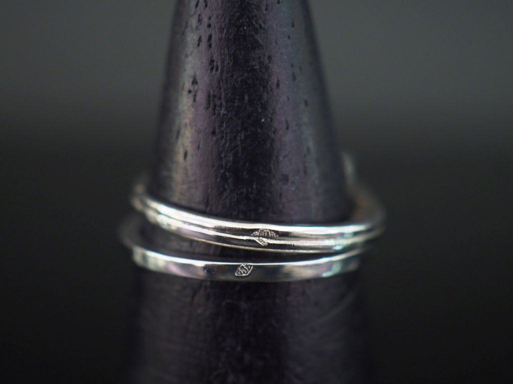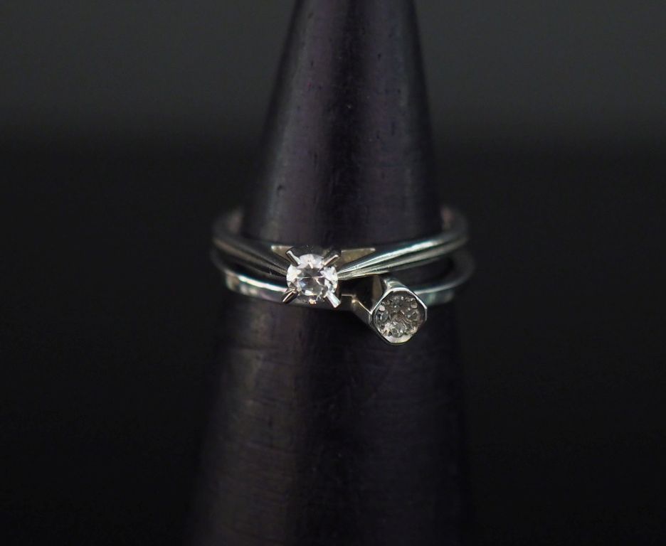 Bague moderne en or blanc, ornée en son centre d'un pavage de quatre petits diamants. TDD. 52 1/2 Poids tel. 2,03 g On y joint une bague solitaire en or blanc 750, sertie en son centre d'une pierre à l'imitation du diamant. TDD. 53 1/2 Poids tel. 2,09 g