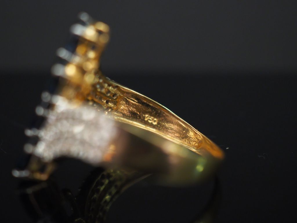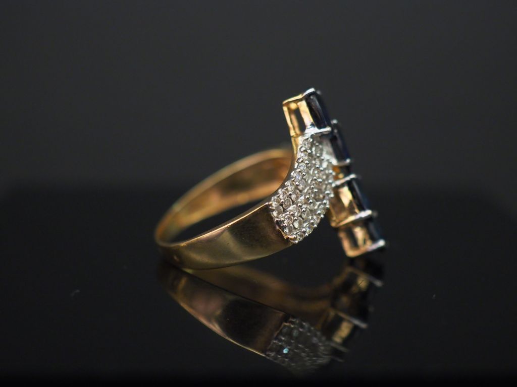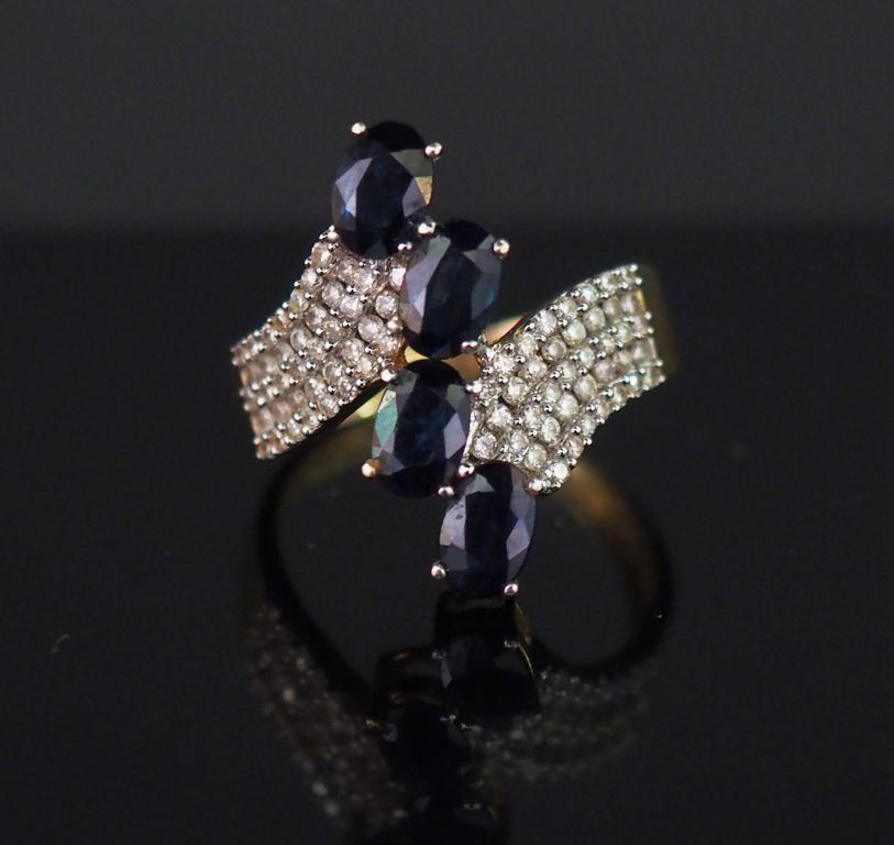 Bague moderne en or jaune, sertie en son centre de quatre saphirs. Monture mouvementée, sertie de part et d’autre de cinq lignes de petits diamants. TDD. 55 Poids tel. 4,54 g