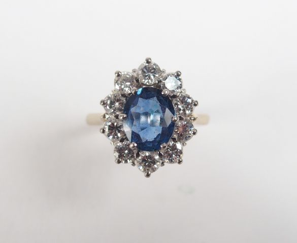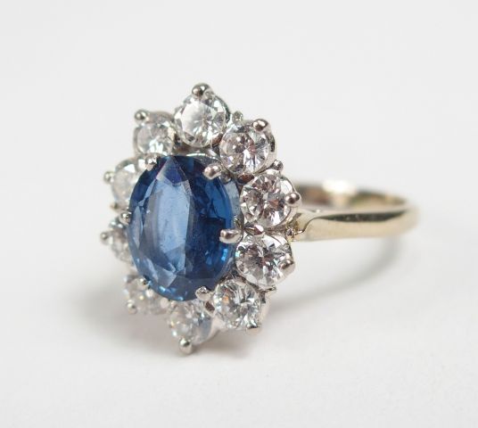 Bague moderne monture or blanc, ornée en son centre d'un saphir de 1,50ct environ, entourage de 10 diamants taille moderne de 0,10ct environ. TDD 55 Poids tel: 4,4gr