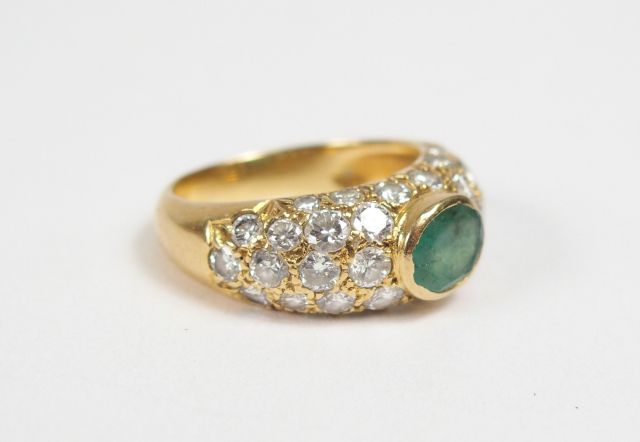 Bague moderne monture or jaune, sertie en son centre d'une émeraude et pavage de diamants taille moderne. TDD 48 Poids tel: 3,9gr