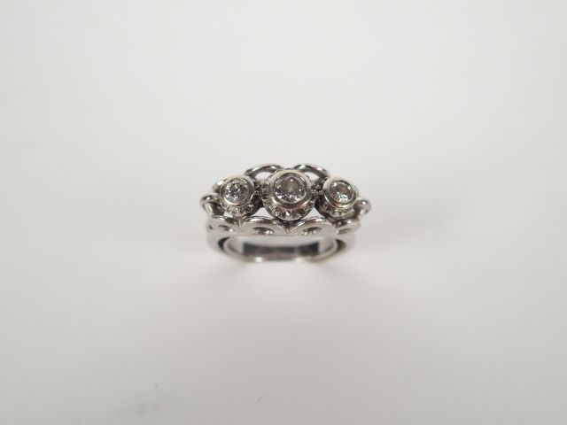 Bague monture ajourée or blanc, sertie de 3 diamants taille ancienne de 0,15cts environ et 2x 0,08cts environ. TDD 49 Poids tel: 7,8gr