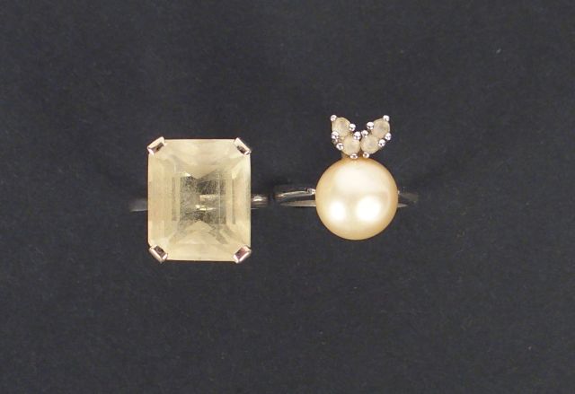 Bague monture or blanc, ornée d'une citrine taille rectangulaire de 13cts environ. TDD 53 Poids tel: 6,3gr On y joint une bague fantaisie en métal, perle et pierres à l'imitation du diamant.