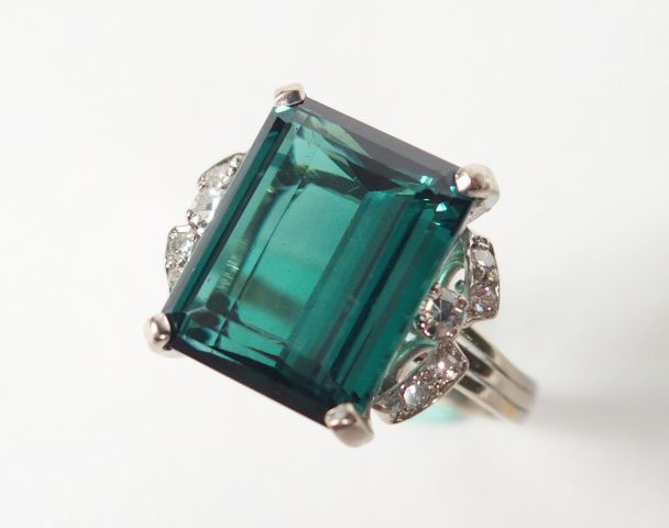 Bague monture or blanc travaillée, ornée d’une gahnite (spinelle) rectangulaire de 8,8ct environ, épaulé de 2 motifs Art déco en diamants taille moderne. TDD 56 Poids tel : 6,1gr