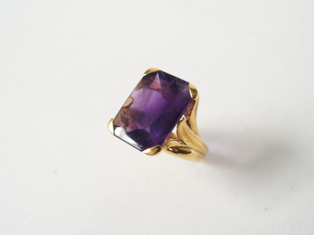 Bague monture or jaune de style Art Nouveau, ornée d’une améthyste taille rectangulaire de 13ct environ. TDD 56 Poids tel : 9,7gr