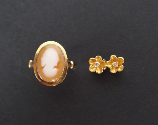 Bague monture or jaune ornée d'un camée "Profil de femme". TDD 43 Poids tel: 2,3gr On y joint une paire de perce-oreilles en forme de fleurs ornées en leur centre d'un brillant de 0,01cts environ. Poids tel: 1gr
