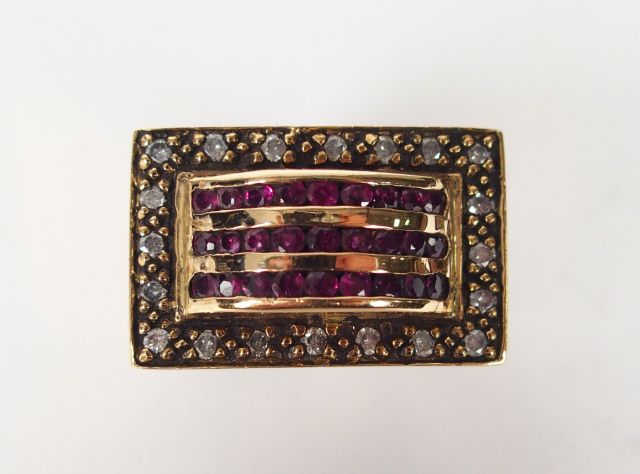 Bague monture or jaune, plateau pavé de diamants taille rose et de rubis taille princesse calibrés. TDD 54 Poids tel : 22,8gr