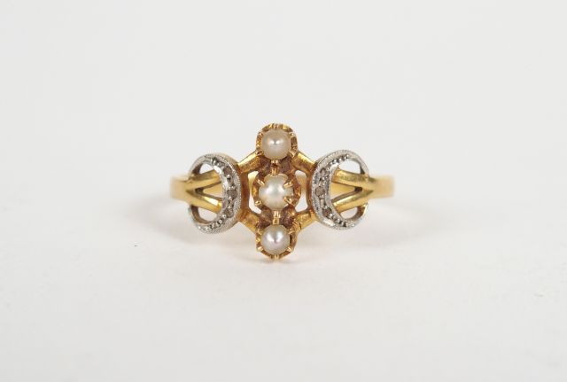 Bague monture or jaune rehaussée de 3 perles. TDD 62 Poids tel: 3,3gr