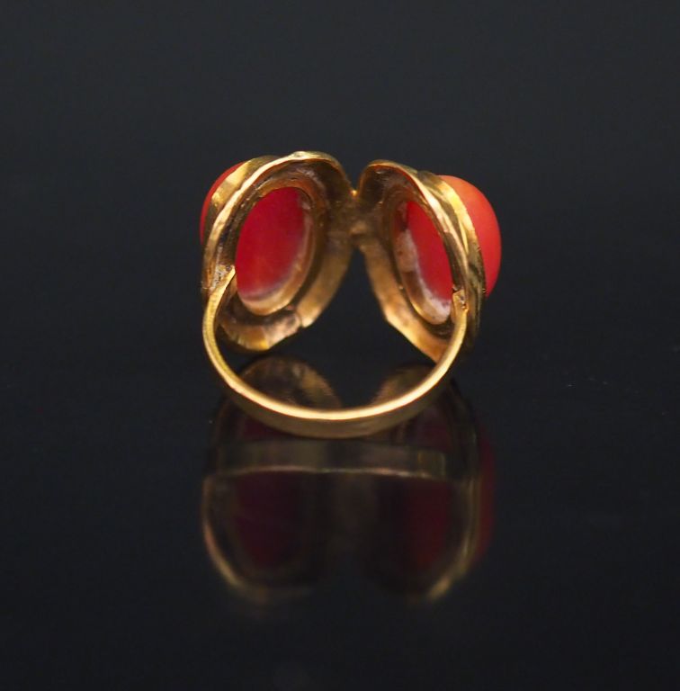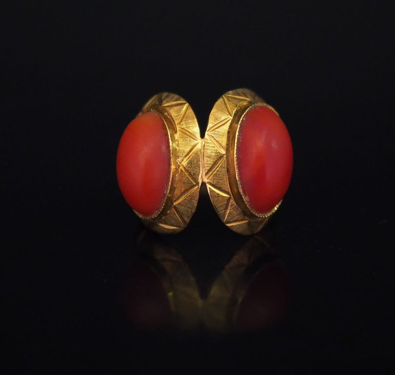 Bague Napoléon III en or jaune, formée de deux médaillons accolés sertis de corail en cabochon. TDD. 48 Poids tel. 6,26 g