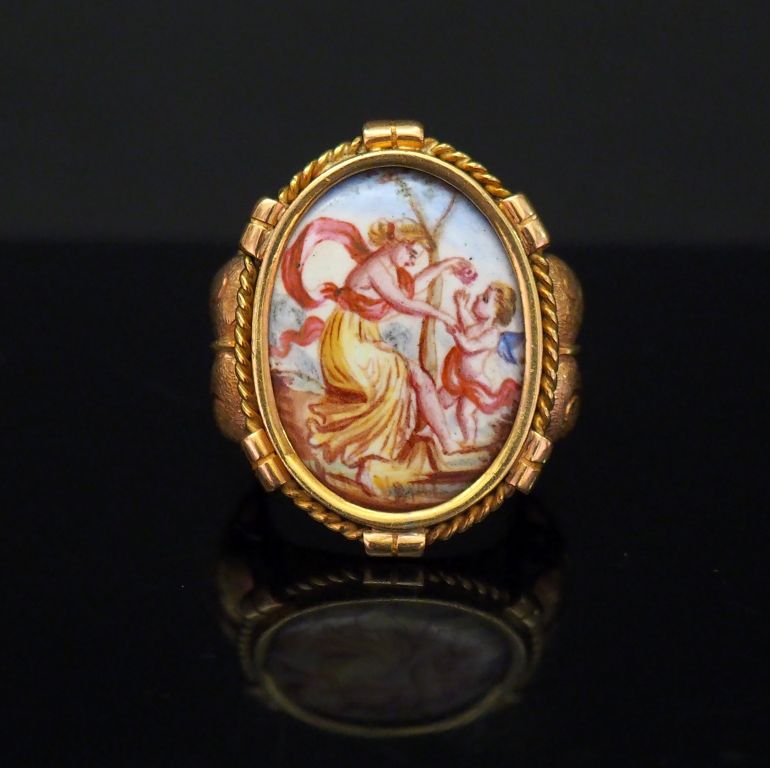 Bague Napoléon III en or jaune, sertie en son centre d'une plaque en porcelaine, à décor polychrome. Monture, à décor de feuille d'acanthe. TDD. 57 Poids tel. 12,25 g