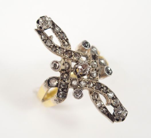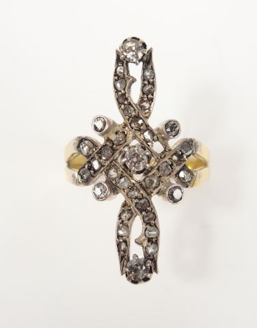 Bague or jaune Napoléon III, décor d'arabesque pavée de diamants taille ancienne ou rose (2 manques). TDD 58 Poids tel: 4,9gr