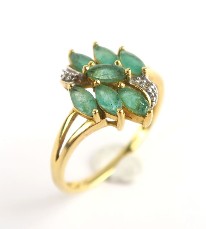 Bague ornée de petites émeraudes de forme navette et de diamants taillés en rose. Monture en or jaune ajourée. Poids tel. 3 g