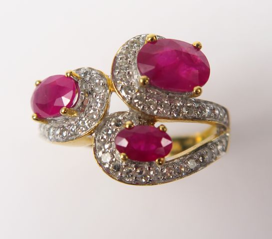 Bague ornée de trois rubis, soulignés par des lignes de diamants. Monture en or jaune. Poids tel : 6,3 g