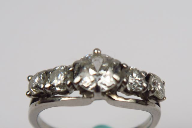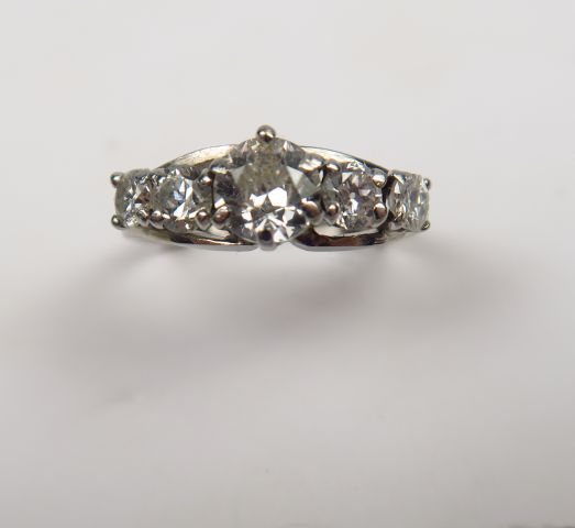 Bague ornée d'un diamant taille moderne de 0,50 carats environ, et de quatre diamants taille ancienne. Monture en or blanc. Poids tel : 2,90 g