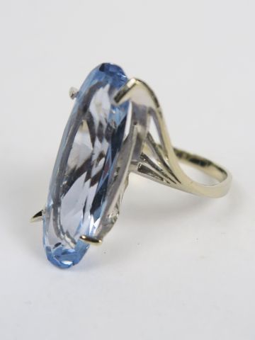 Bague ornée d'une grande topaze bleue, sur une monture originale en or blanc. Poids tel : 5,8 g