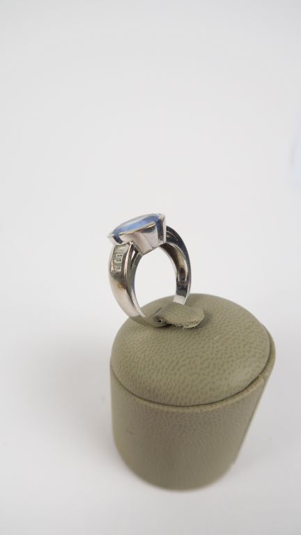 Bague platine, saphir entouré de six brillants taille baguette. Poids : 11 g