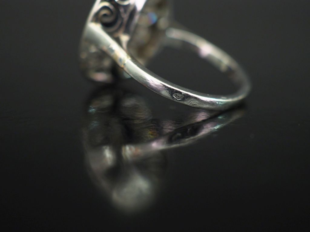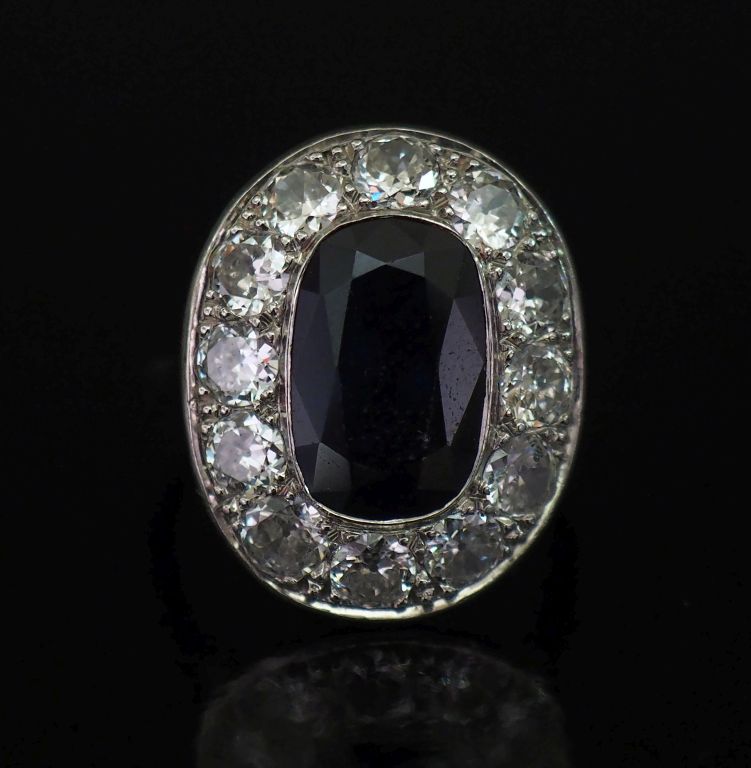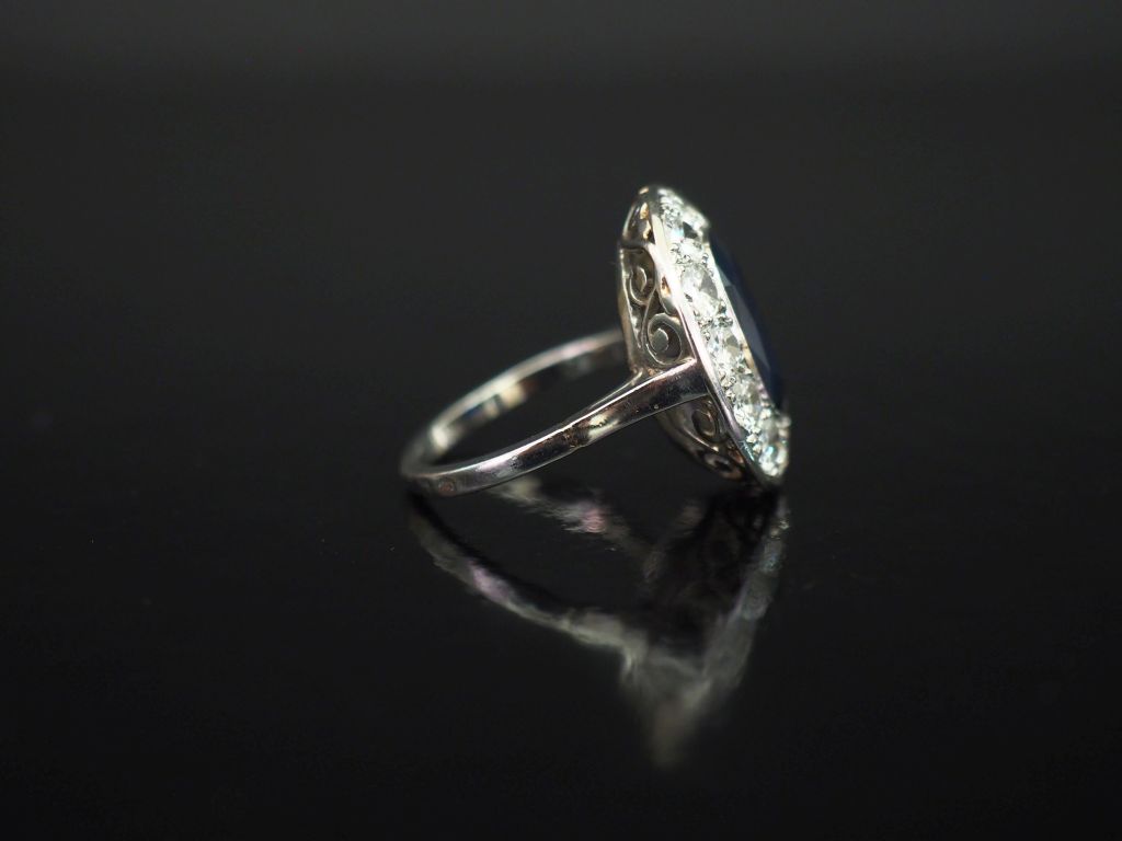 Bague pompadour en platine 850, sertie en son centre d'un saphir entouré d'une couronne de douze diamants de 0,10 ct environ. TDD. 54 Poids tel. 7,71 g