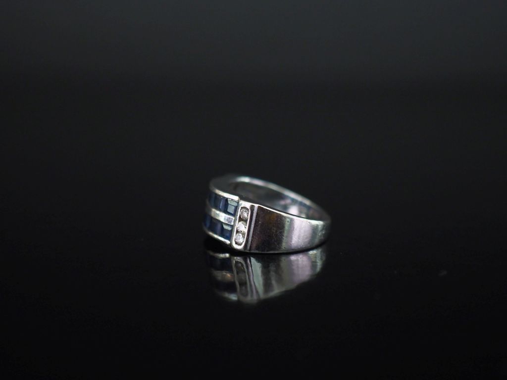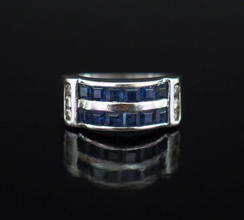 Bague pont en or blanc 750, sertie de deux lignes de saphirs calibrées en son centre et agrémentée sur les côtés de six petits diamants. TDD. 48 Poids tel. 4,29 g