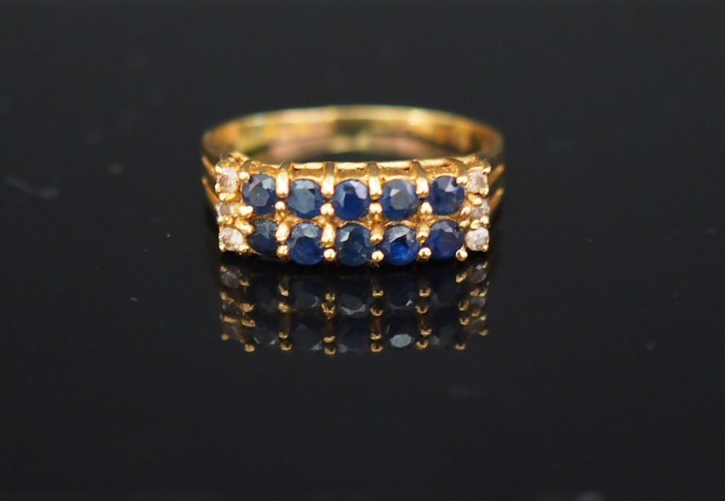 Bague pont en or jaune, sertie de deux lignes de pierres bleues et de six petits diamants. TDD. 51 Poids tel. 2,52 g (à charge de contrôle)