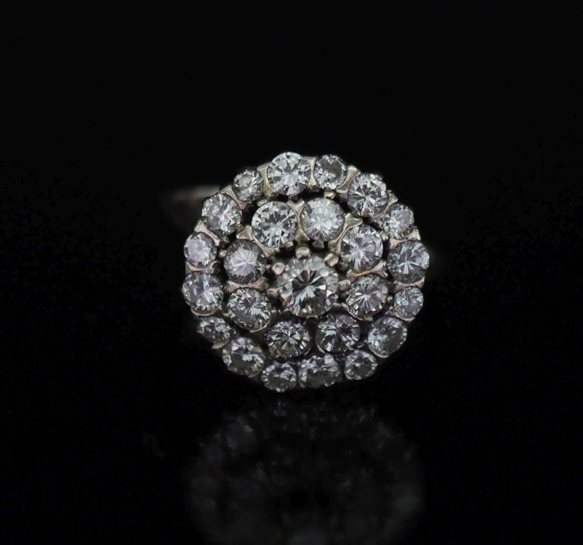 Bague ronde en or blanc 750, sertie en son centre d'une diamant taille ancienne de 0,10 ct environ entouré de deux couronnes de diamants. TDD. 59 1/2 Poids tel. 6,56 g