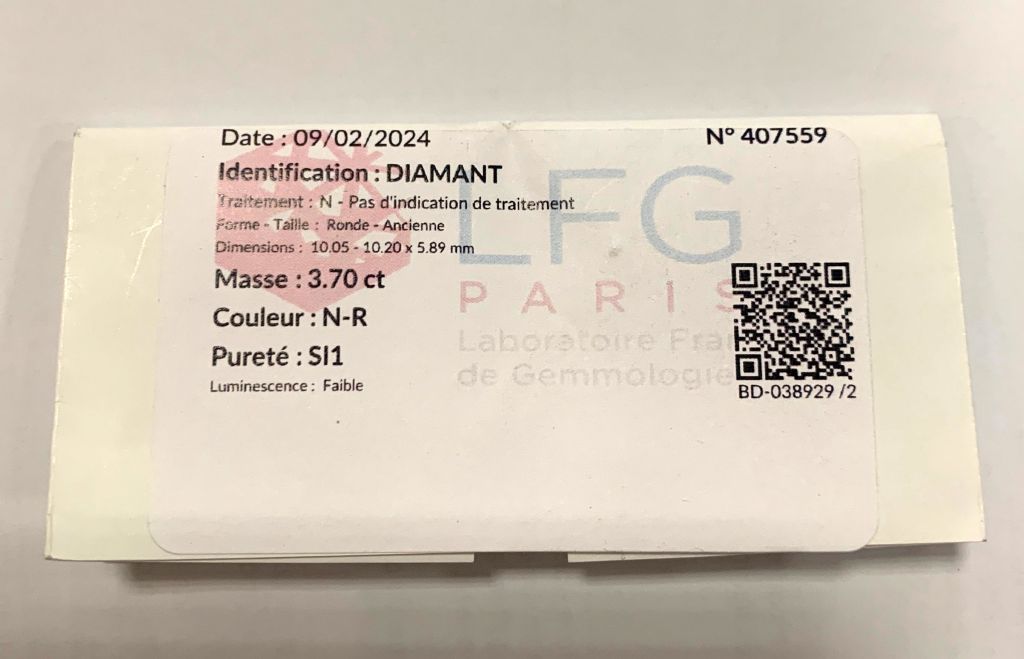Bague solitaire en or blanc, sertie en son centre d'un diamant taille ancienne de 3,70 ct N-R SI1. TDD. 51 Poids tel. 3,44 g Examen préliminaire du Laboratoire Français de Gemmologie.