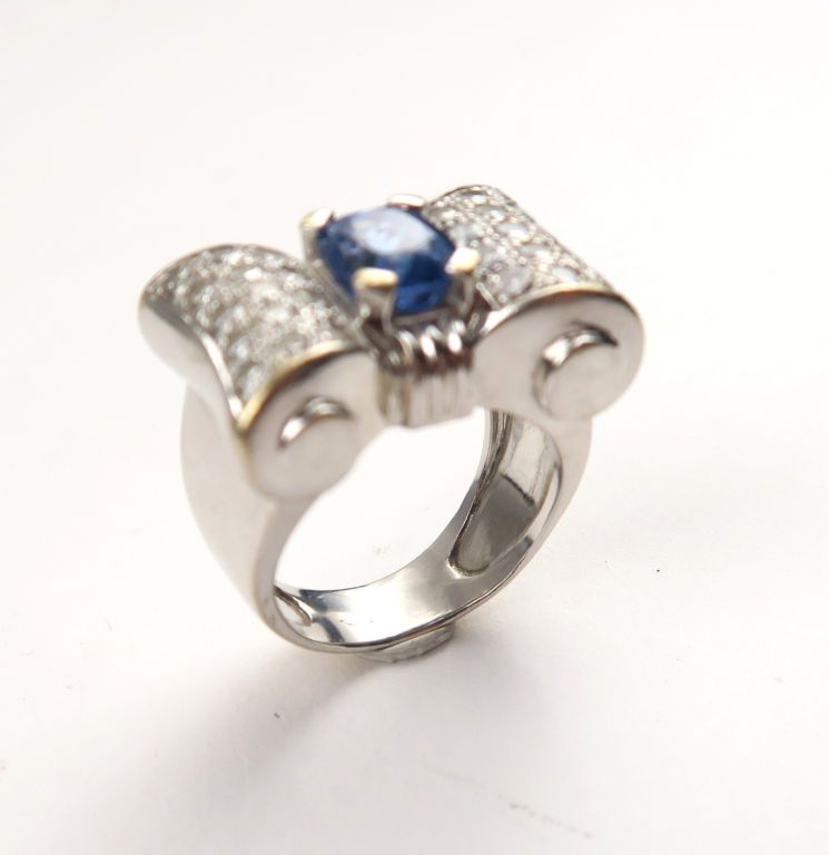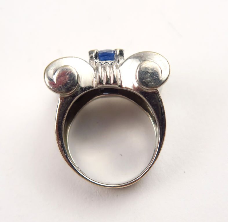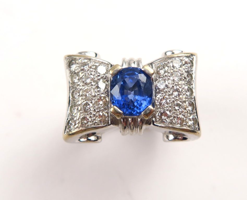 Bague tank en or blanc ornée d'un saphir et pavage de diamants. Monture en or blanc. TDD. 52 Poids tel. 13,44 g