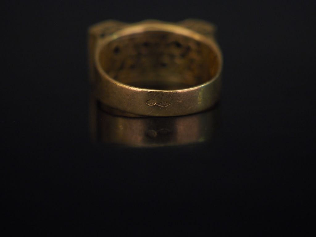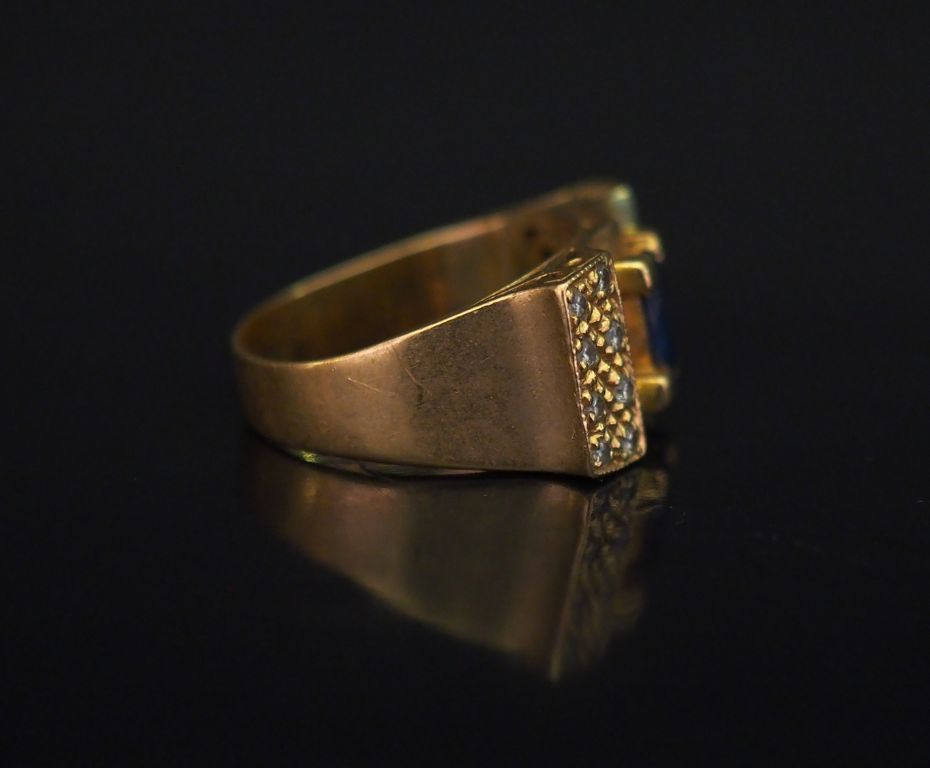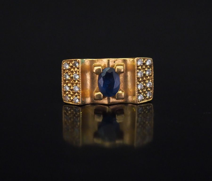 Bague tank en or jaune, sertie en son centre d'une pierre bleue et de quatre lignes de quatre petits diamants. TDD. Poids tel. 8,80 g