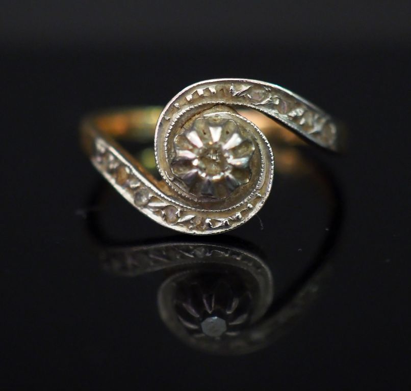 Bague tourbillon en or jaune, sertie en son centre d’un petit diamant. Jolie monture mouvementée, sertie de petits éclats de diamant. TDD. 53 Poids tel. 2,72 g