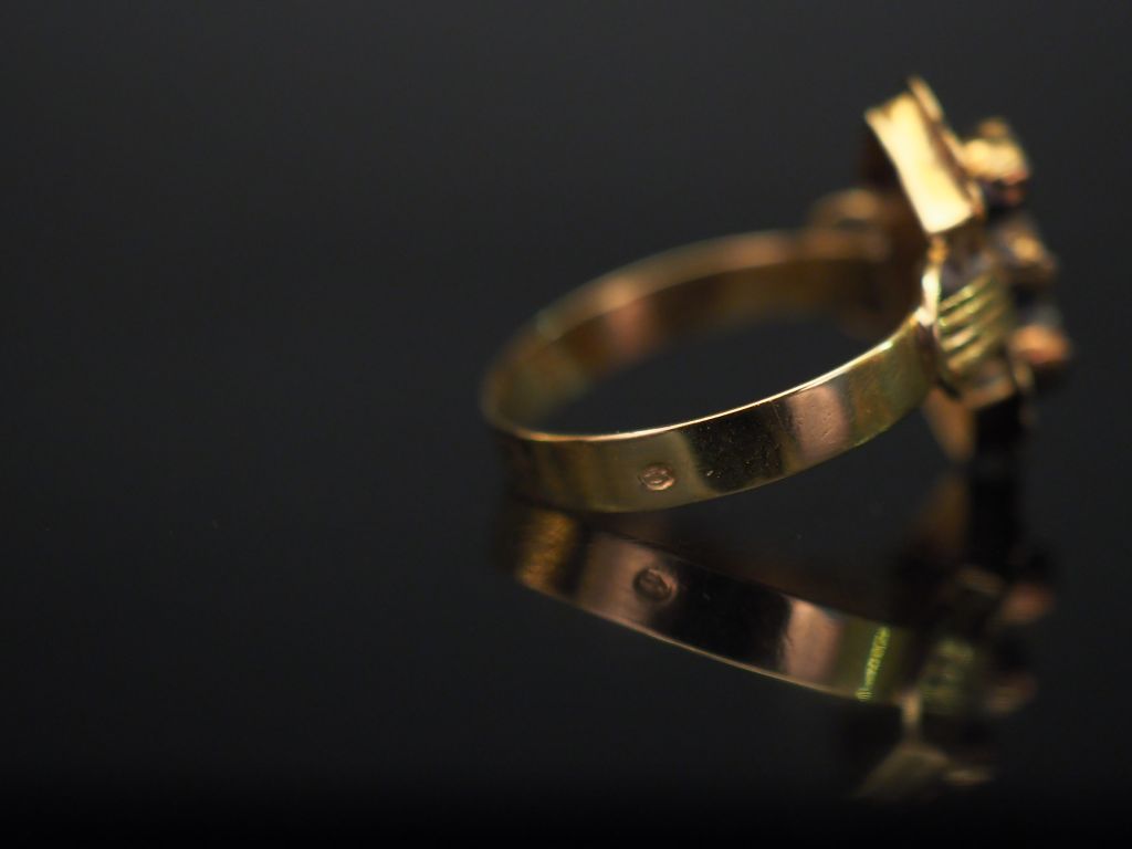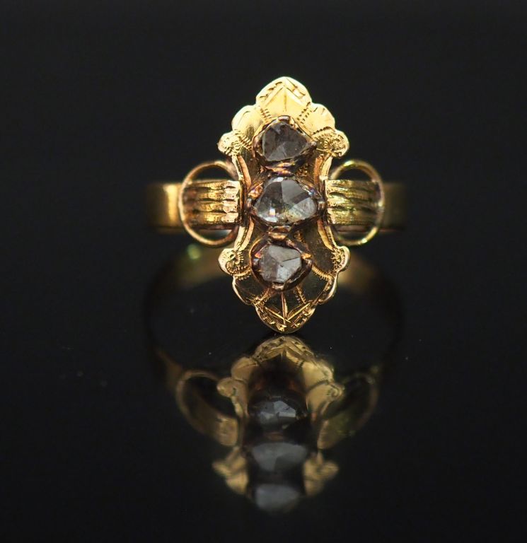 Bague XIXème de forme marquise, sertie en son centre d'une ligne de trois diamants taillés en rose. TDD. 54 Poids tel. 2,86 g