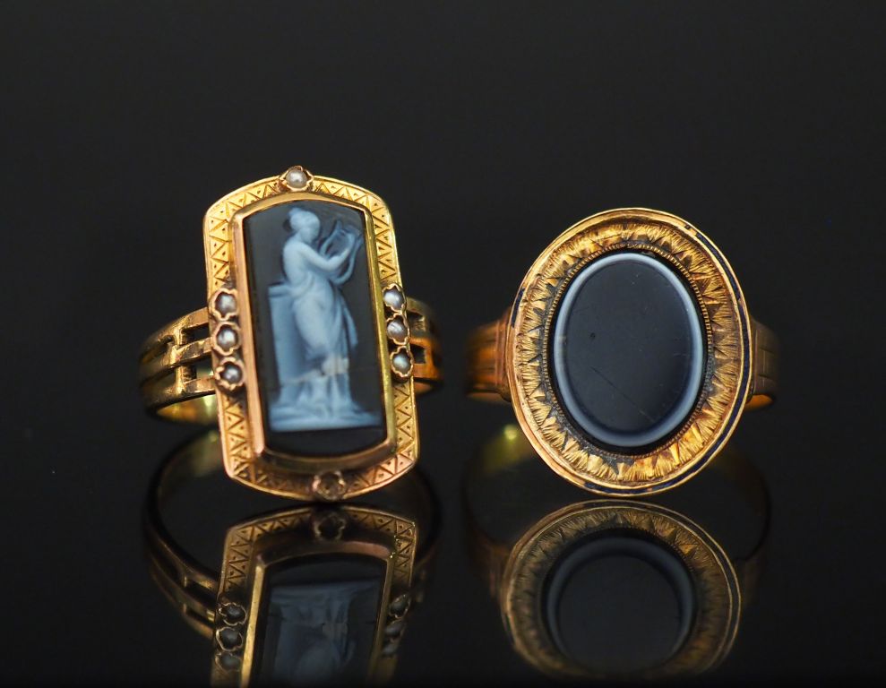 Bague XIXème en or jaune et émail noir, sertie en son centre d'une pierre dure ovale. TDD. 61 Poids tel. 2,32 g (pierre légèrement accidentée, sauts d'émail) On y joint une bague Napoléon III en or jaune agrémentée de petites perles blanches, sertie en son centre d'un camée figurant une jeune femme à la lyre. TDD. 54 Poids tel. 5,11 g (manque une perle, camée accidenté)