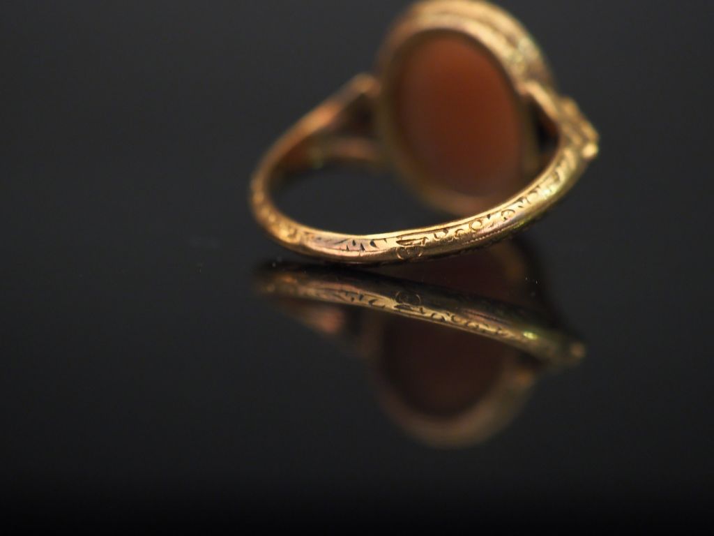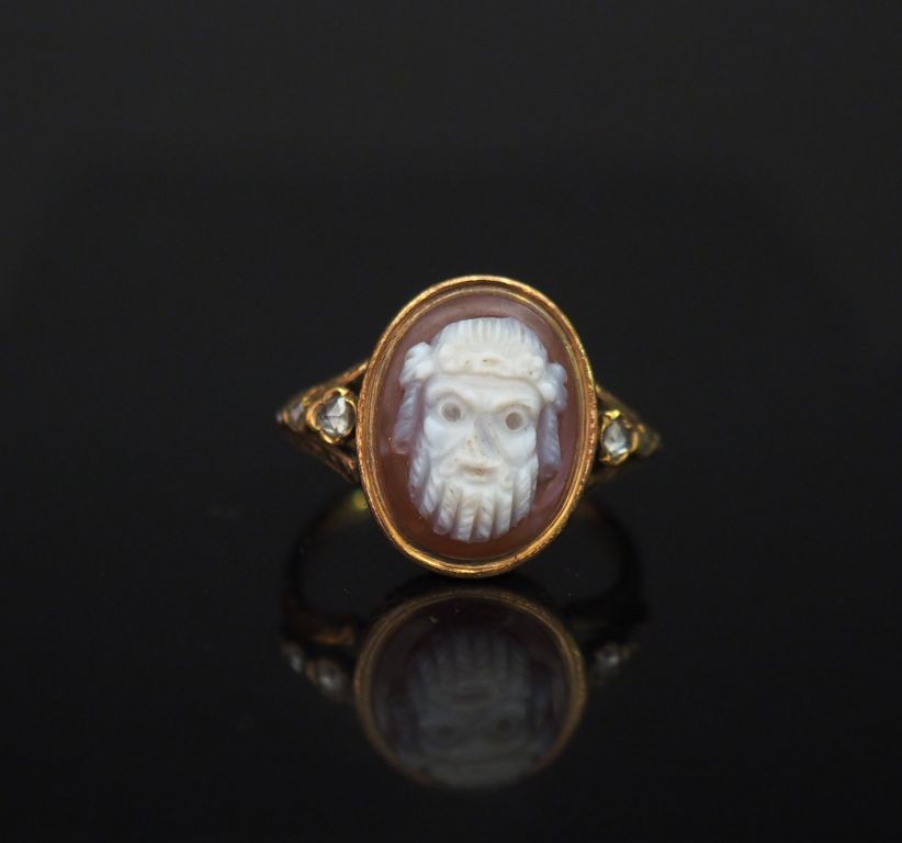 Bague XIXème en or jaune, sertie en son centre d'un camée à décor de masque. Jolie monture sertie de six petits éclats de diamant disposés en chute. TDD. 50 Poids tel. 4,07 g