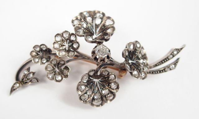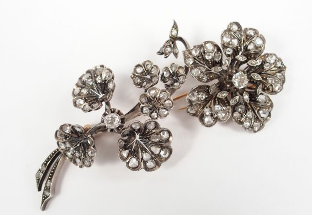 Bijoux à transformation en or blanc composé de 2 broches en forme de branche fleurie et de fleur épanouie, l'ensemble pavé de diamants taille ancienne et taille rose ou anversoise. Circa 1900. J. PERET NEVEU à Clermont-Ferrand. Dans son écrin d'origine. Poids tel: 32,5gr