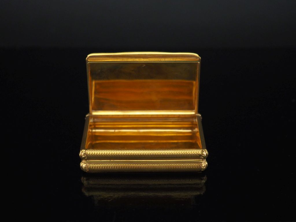 Boite à tabac de forme rectangulaire en or jaune 750, à décor d'un cartouche marqué "Chatelain" sur fond guilloché. 2 x 8 x 5,1 cm Poids. 91,43 g Dans un écrin marqué Cartier.