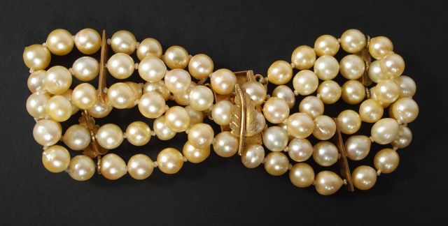 Bracelet 3 rangs de perles de culture, agrémenté de 3 motifs de feuille, fermoir en or jaune. 21,5cm