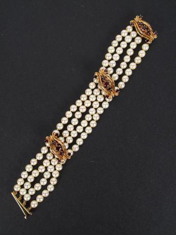 Bracelet 4 rangs de perles de culture de 5,5mm, rehaussé de 3 médaillons en or jaune et grenats