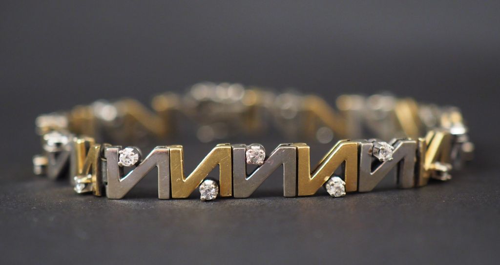 Bracelet articulé deux tons d'or et vingt-deux petits diamants, à décor de motifs géométriques. Long. 18,5 cm Poids tel. 23,05 g