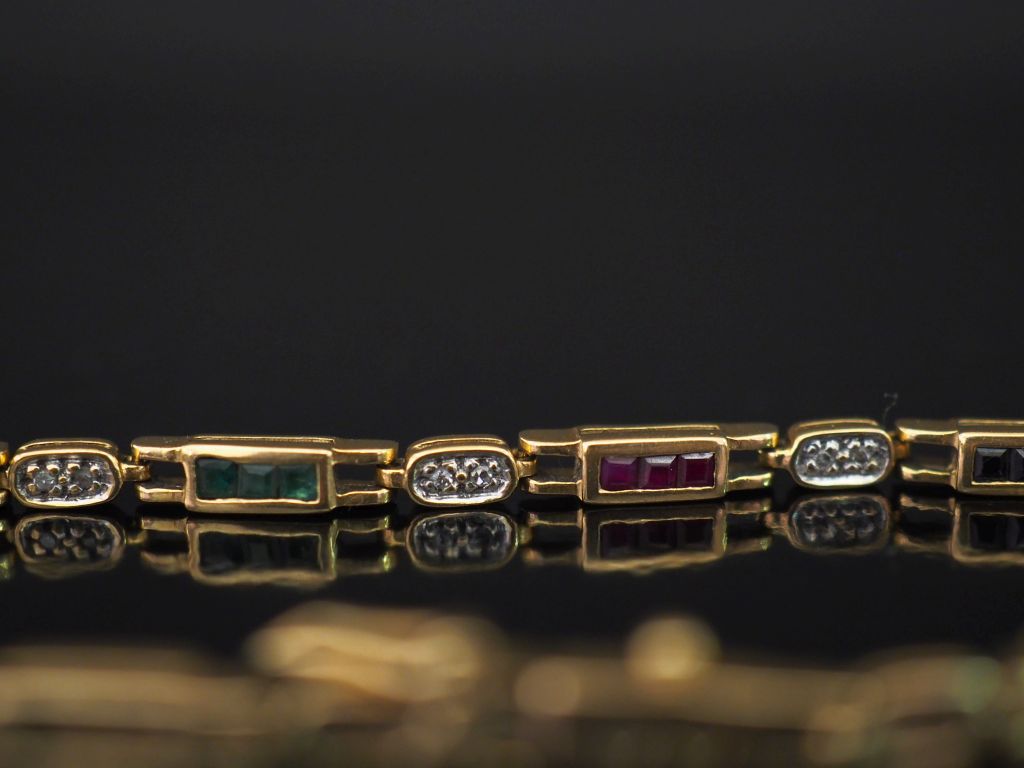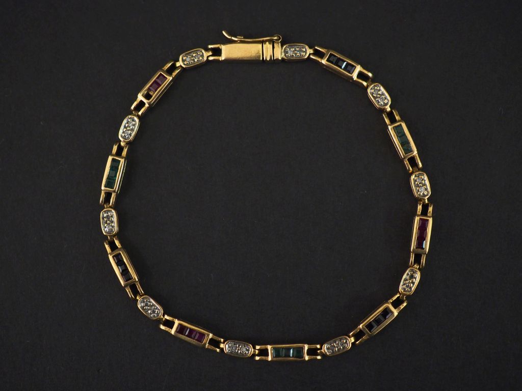 Bracelet articulé en or jaune 14k, composé de maillons sertis de petits diamants et maillons sertis de pierres de couleur alternés. Long. 18 cm Poids tel. 8,10 g (petit manque)