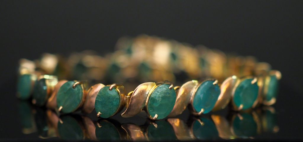 Bracelet articulé en or jaune 14k, serti de dix-neuf émeraudes. Long. 17 cm Poids tel. 9,69 g (accidenté, petits accidents à certaines pierres)