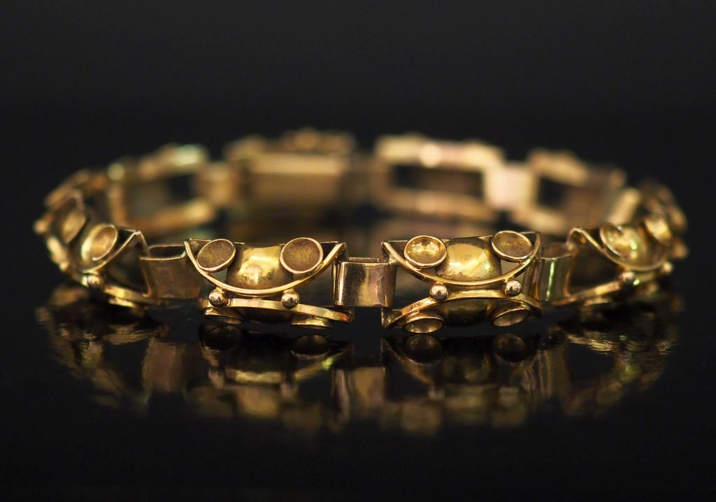Bracelet articulé en or jaune, composé de maillons de forme bombée, à décor de pastilles. Long. 20,5 cm Poids. 24,71 g