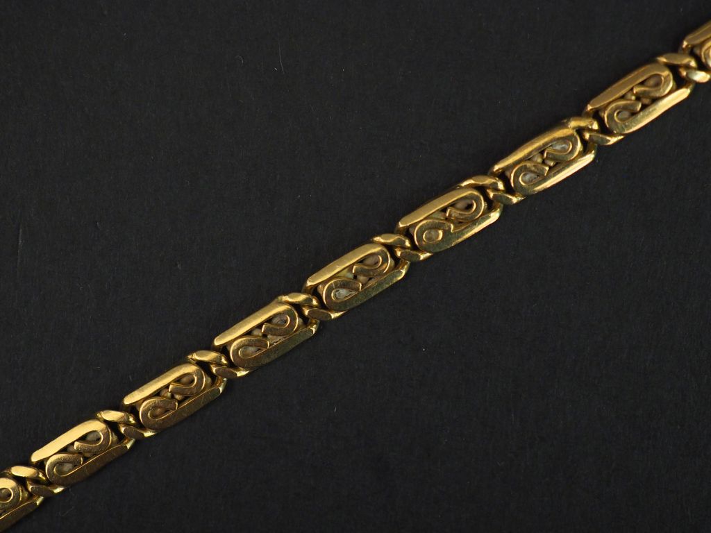 Bracelet articulé en or jaune, composé de maillons rectangulaires filigranés. Long. 19,4 cm Poids. 11,16 g (fermoir accidenté)