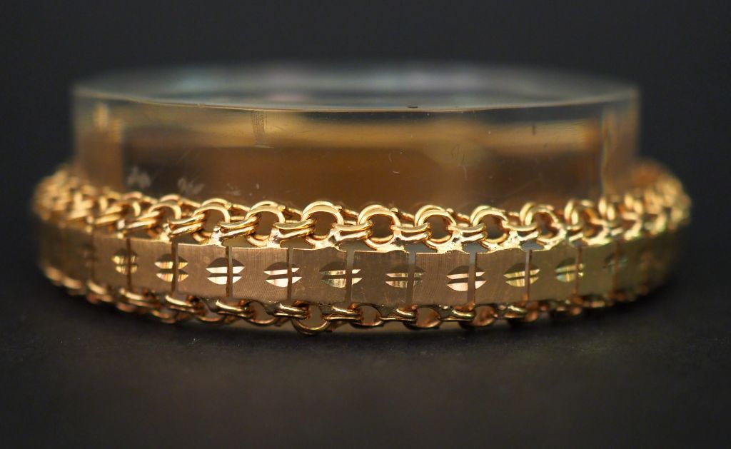 Bracelet articulé en or jaune, maille carrée et entrelacée. Chainette de sécurité. Poids. 26,64 g