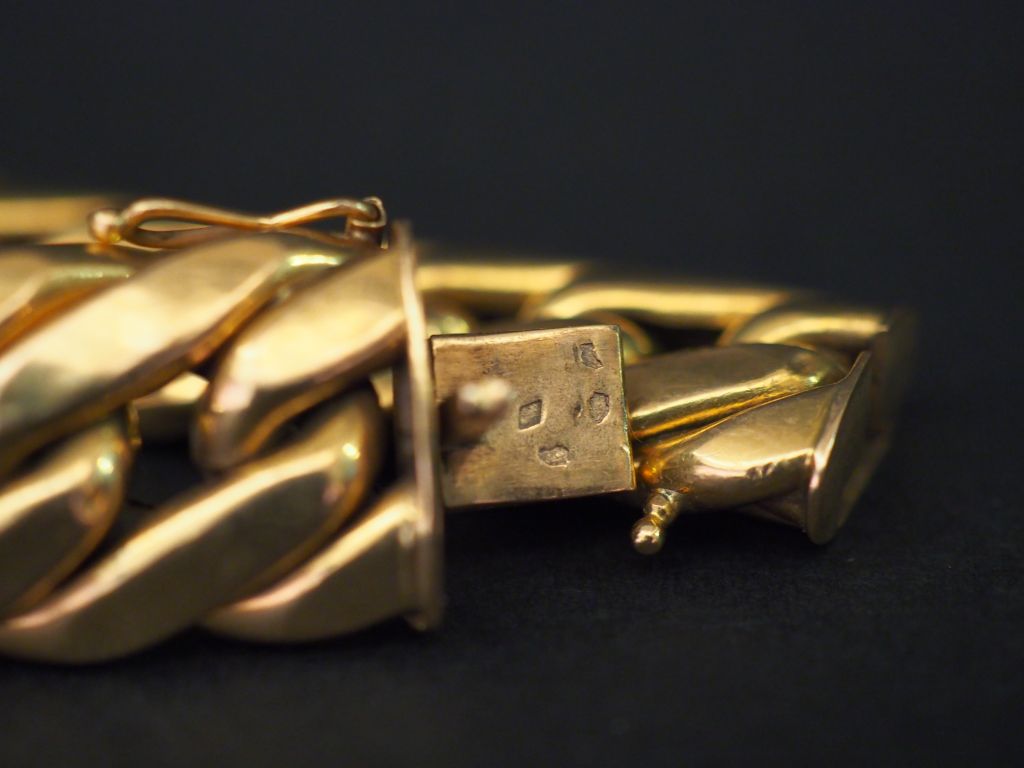 Bracelet articulé en or jaune, maille gourmette. Long. 18,5 cm Poids. 29,09 g (très légers enfoncements)
