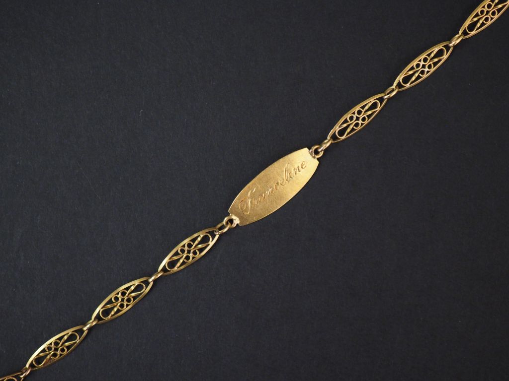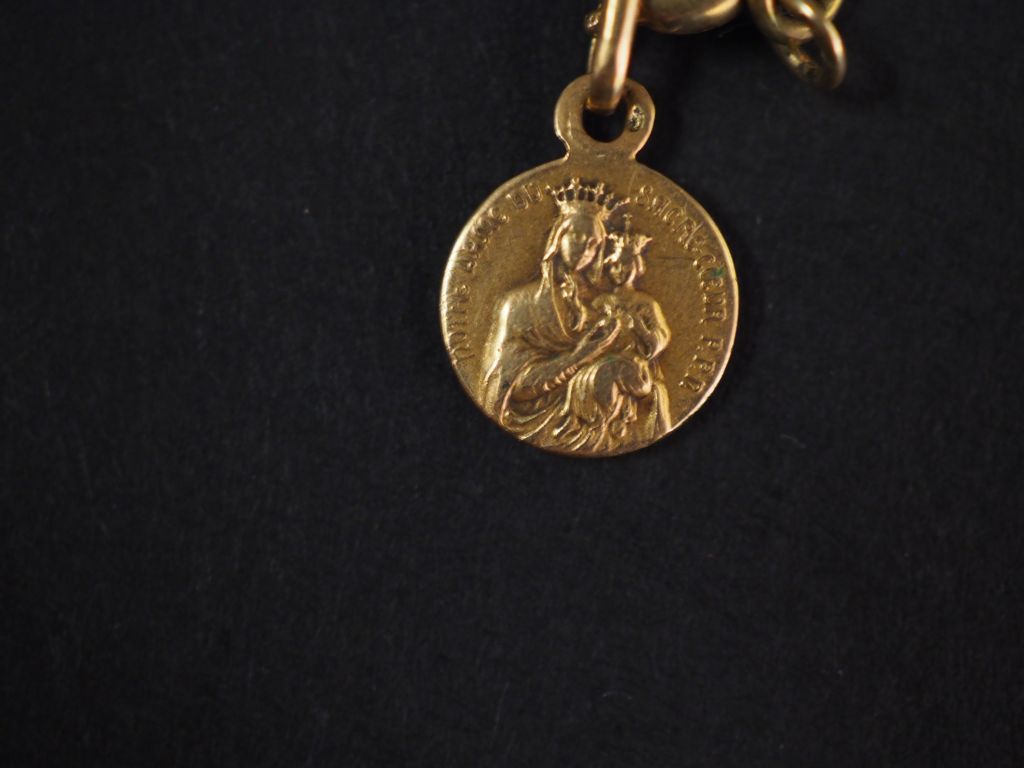 Bracelet de naissance en or jaune, à décor de maillons filigranés. Long. 17 cm On y joint une petite médaille religieuse en or jaune. Poids. 3,90 g (gravé, fermoir accidenté)