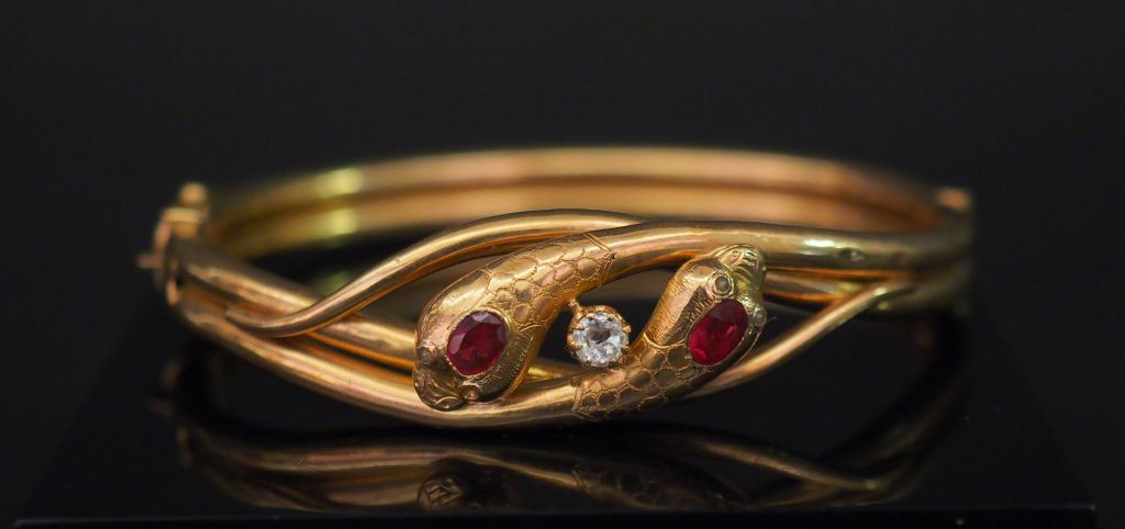 Bracelet en or et pierres rouges à décor de serpent. Poids tel : 18 g