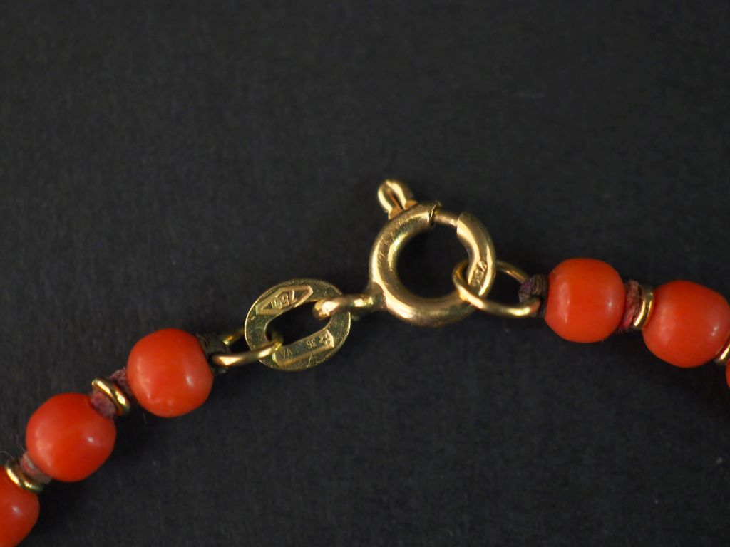 Bracelet en or jaune, orné de perles de corail. Long. 20 cm Poids tel. 4,84 g (petit manque, fil légèrement distendu à un endroit)