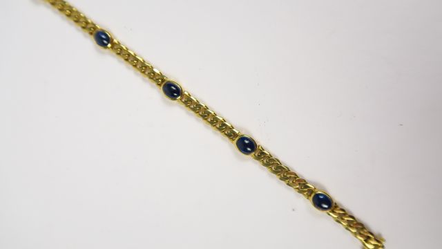 Bracelet en or maille gourmette, alternance de saphirs en cabochon. Poids tel : 16 g