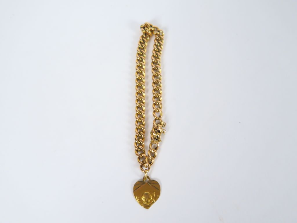 Bracelet en or, maille gourmette, retenant une médaille avec un ange. ...