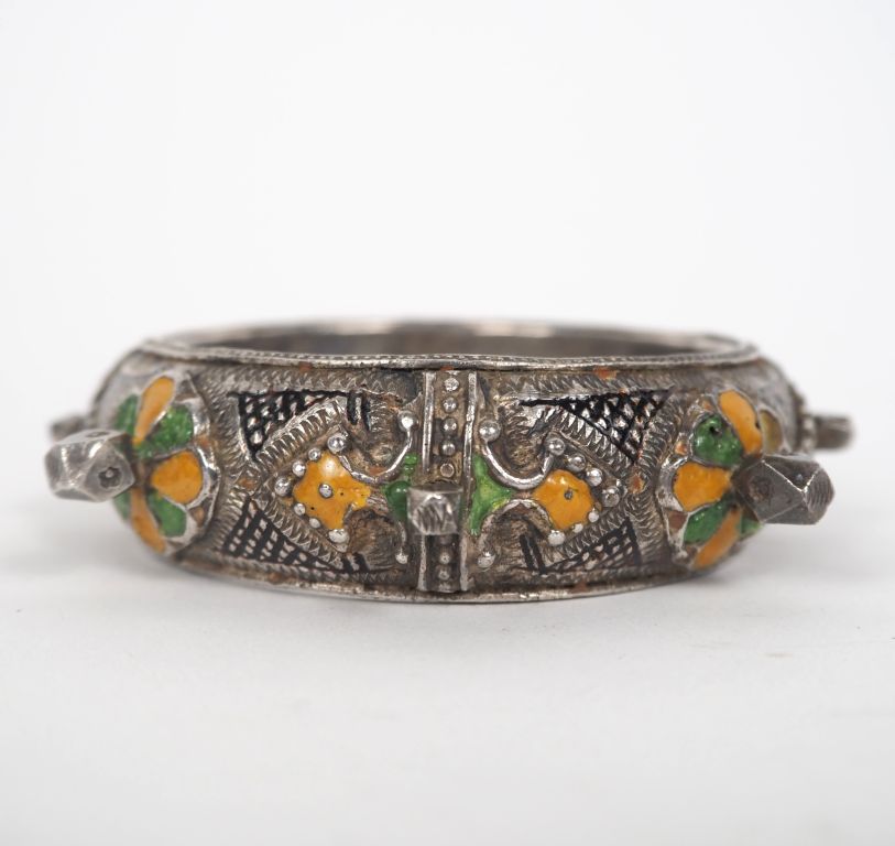 Bracelet jonc Afrique du Nord en argent, à décor émaillé polychrome et agrémenté de motifs géométriques en relief. Diam. interne : 6,1 cm Poids tel. 71 g